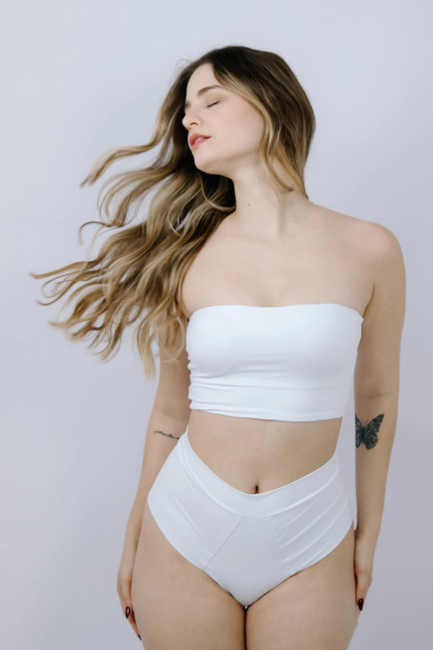 Descubra o conforto e a elegância do Conjunto em Microfibra Top Reto Sem Alça com Calcinha Cintura Alta na cor Branco, perfeito para quem busca praticidade aliada ao estilo moderno.